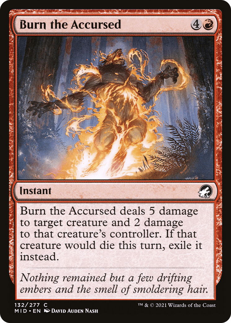 Burn the Accursed deals 5 damage to target creature and 2 damage to that creature’s controller. If that creature would die this turn, exile it instead.