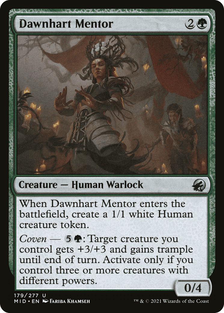 Coven – {5}{G}: Target creature you control gets +3/+3 and gains trample until end of turn. Activate only if you control three or more creatures with different powers.