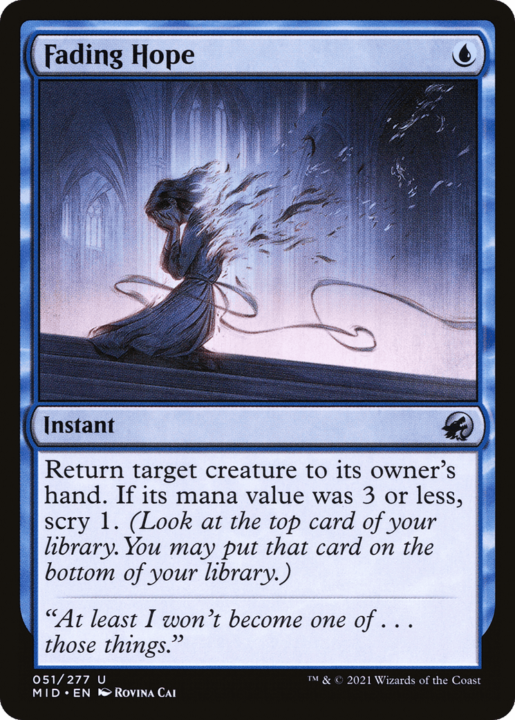 Return target creature to its owner’s hand. If its mana value was 3 or less, scry 1. (Look at the top card of your library. You may put that card on the bottom.)