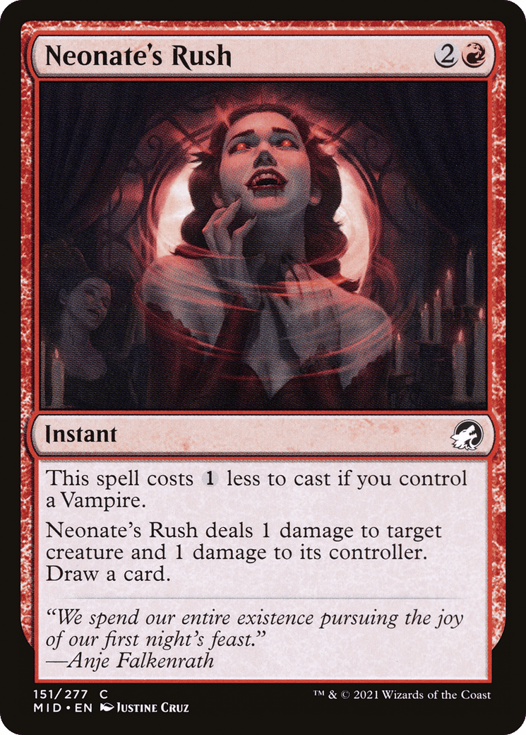 Neonate’s Rush deals 1 damage to target creature and 1 damage to its controller. Draw a card.
