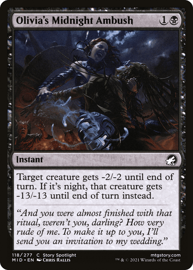 Target creature gets -2/-2 until end of turn. If it’s night, that creature gets -13/-13 until end of turn instead.