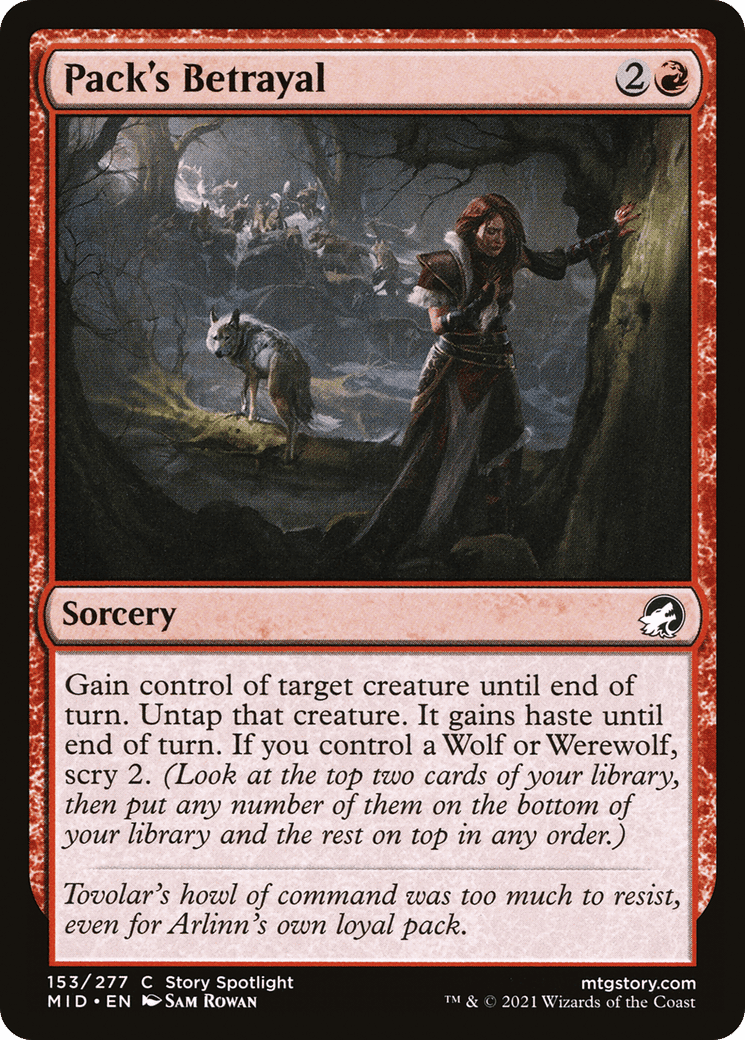Gain control of target creature until end of turn. Untap that creature. It gains haste until end of turn. If you control a Wolf or Werewolf, scry 2. (Look at the top two cards of your library, then put any number of them on the bottom and the rest on top