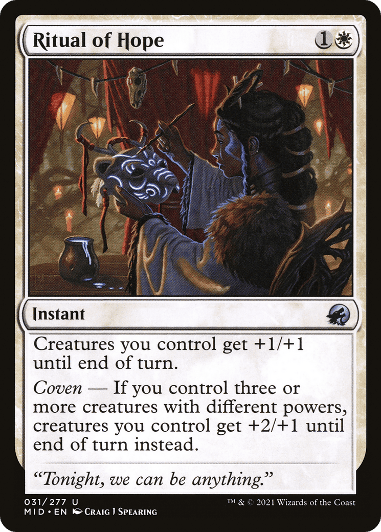 Coven – If you control three or more creatures with different powers, creatures you control get +2/+1 until end of turn instead.