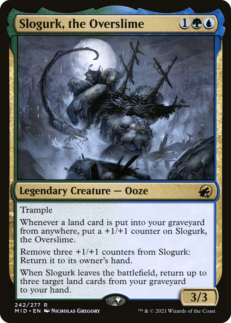 Whenever a land card is put into your graveyard from anywhere, put a +1/+1 counter on Slogurk.