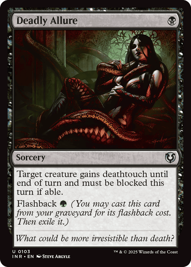 Target creature gains deathtouch until end of turn and must be blocked this turn if able.