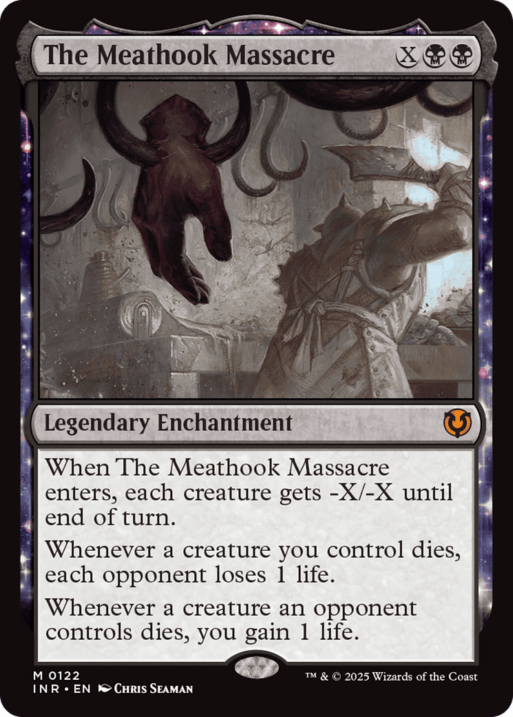 When The Meathook Massacre enters, each creature gets -X/-X until end of turn.