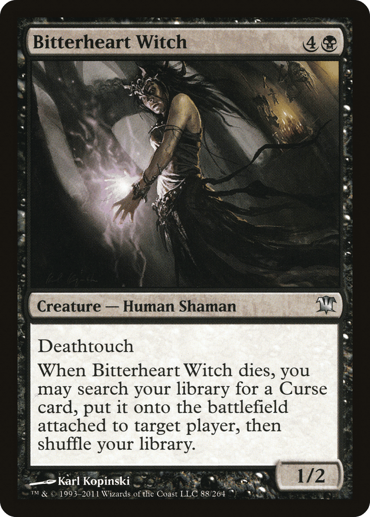 Deathtouch When this creature dies, you may search your library for a Curse card, put it onto the battlefield attached to target player, then shuffle.