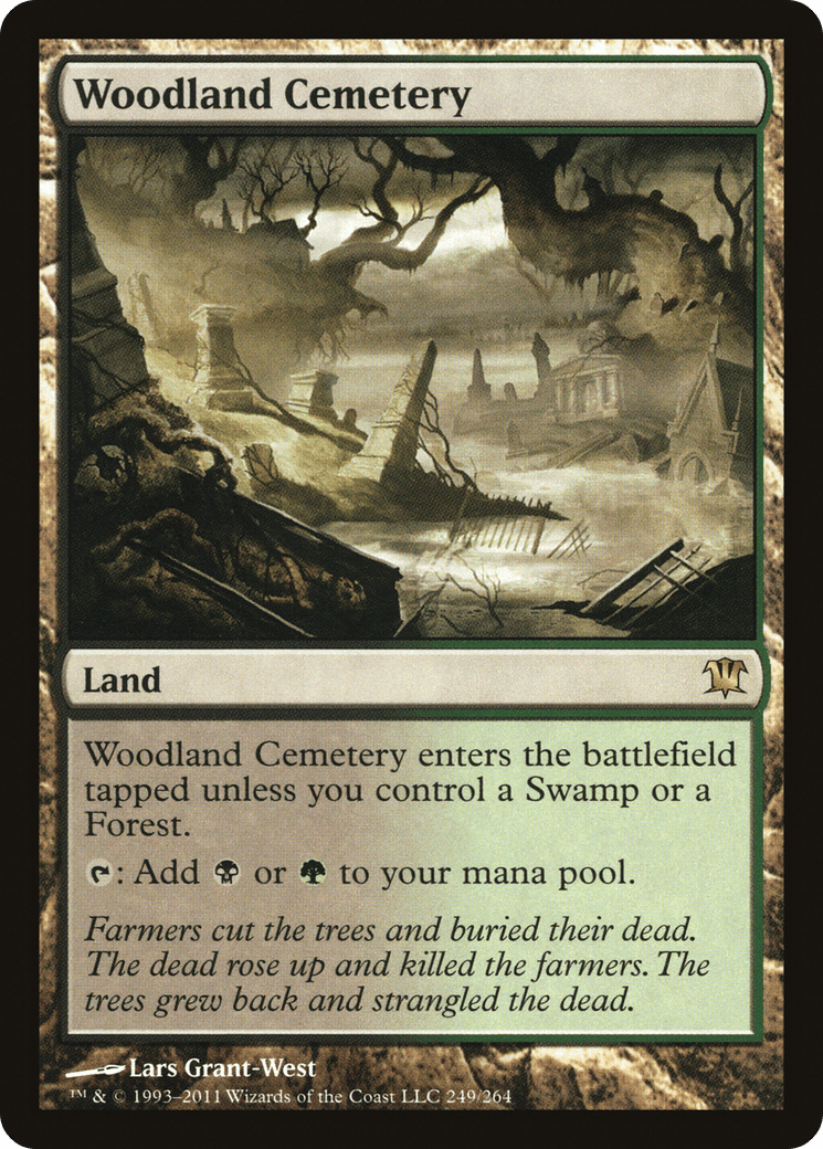 Farmers cut the trees and buried their dead. The dead rose up and killed the farmers. The trees grew back and strangled the dead.
