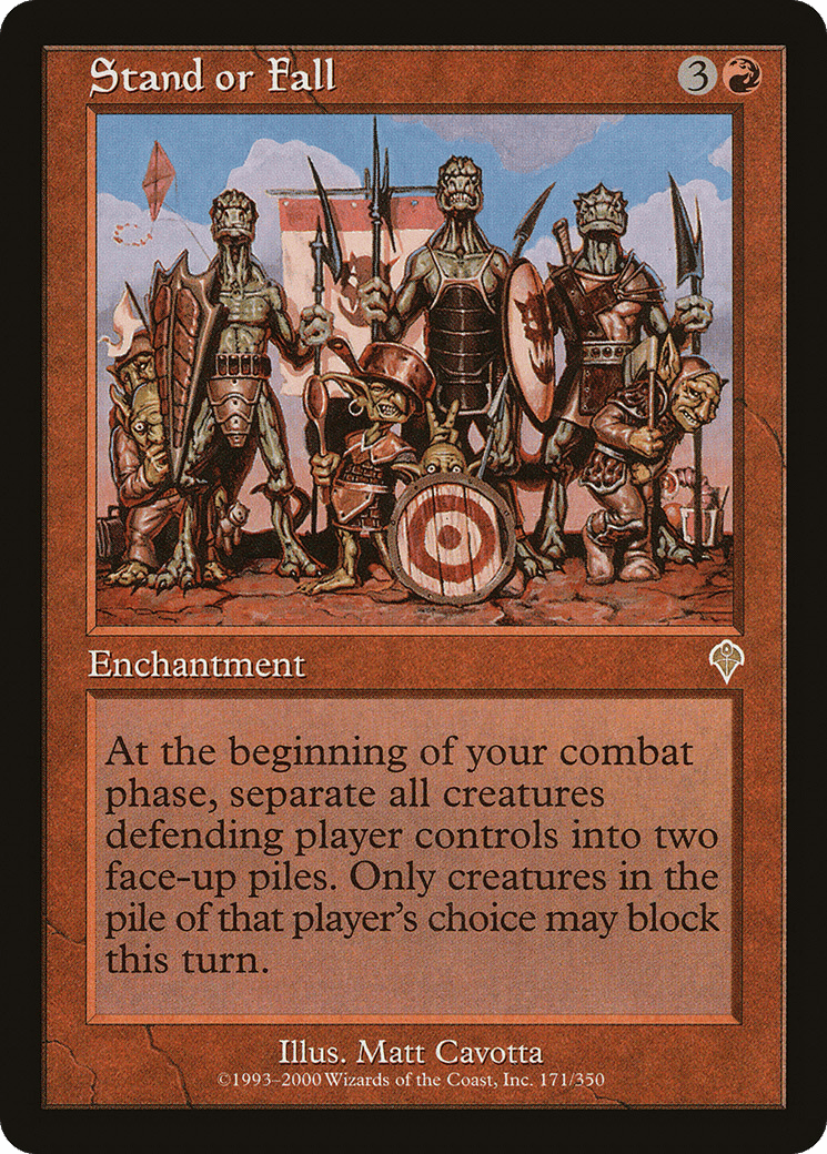 At the beginning of combat on your turn, for each defending player, separate all creatures that player controls into two piles and that player chooses one. Only creatures in the chosen piles can block this turn.