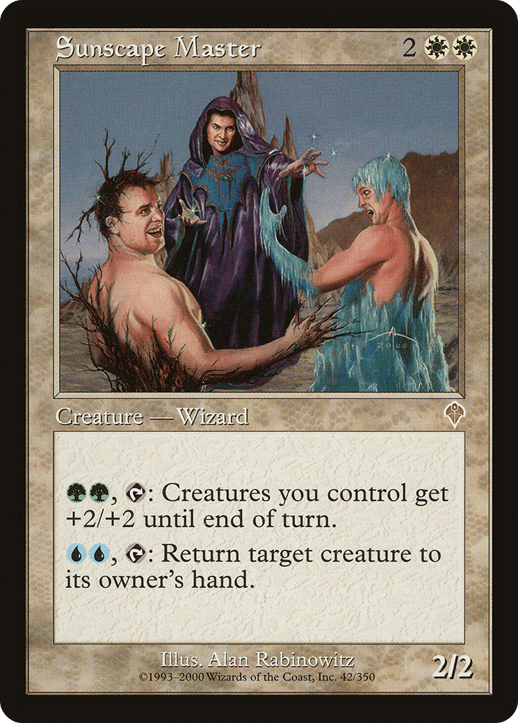 {G}{G}, {T}: Creatures you control get +2/+2 until end of turn. {U}{U}, {T}: Return target creature to its owner’s hand.