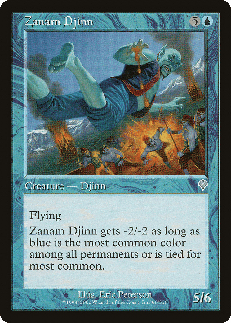 Flying This creature gets -2/-2 as long as blue is the most common color among all permanents or is tied for most common.