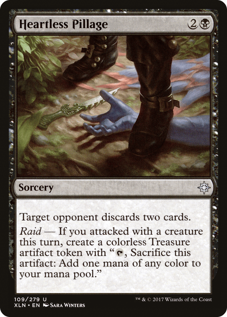 Target opponent discards two cards. Raid – If you attacked this turn, create a Treasure token. (It’s an artifact with “{T}, Sacrifice this token: Add one mana of any color.”)