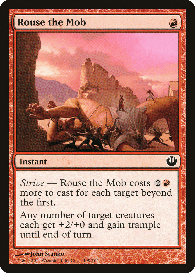 Strive – This spell costs {2}{R} more to cast for each target beyond the first. Any number of target creatures each get +2/+0 and gain trample until end of turn.