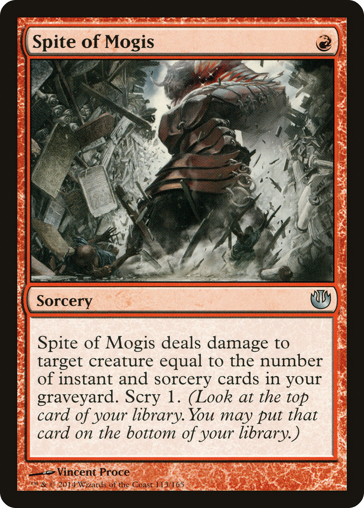 Spite of Mogis deals damage to target creature equal to the number of instant and sorcery cards in your graveyard. Scry 1. (Look at the top card of your library. You may put that card on the bottom.)