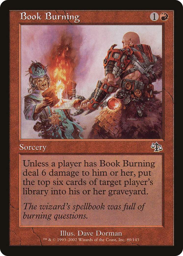 Any player may have Book Burning deal 6 damage to them. If no one does, target player mills six cards.