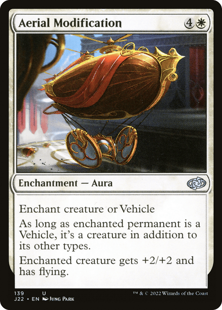 Enchant creature or Vehicle As long as enchanted permanent is a Vehicle, it’s a creature in addition to its other types. Enchanted creature gets +2/+2 and has flying.
