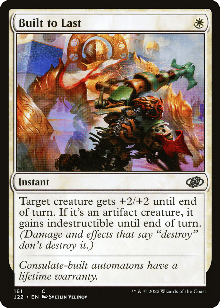 Target creature gets +2/+2 until end of turn. If it’s an artifact creature, it gains indestructible until end of turn. (Damage and effects that say “destroy” don’t destroy it.)