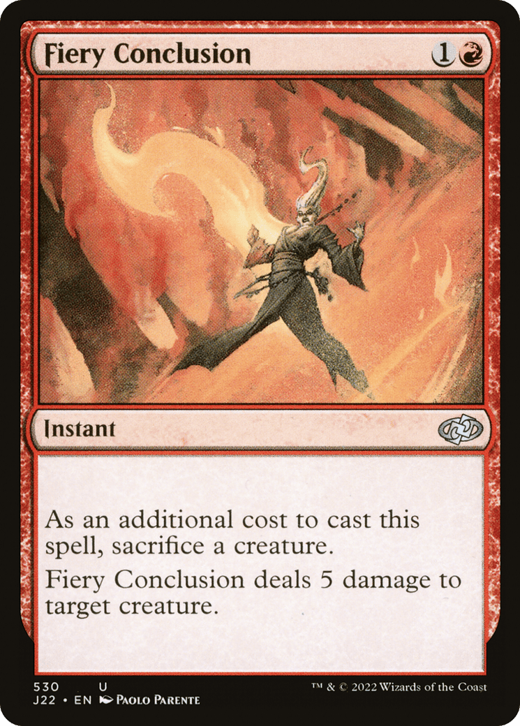 As an additional cost to cast this spell, sacrifice a creature. Fiery Conclusion deals 5 damage to target creature.