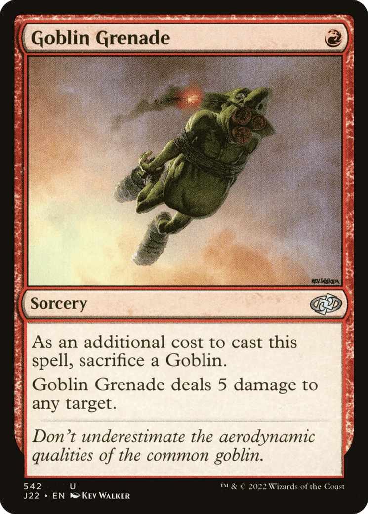As an additional cost to cast this spell, sacrifice a Goblin. Goblin Grenade deals 5 damage to any target.