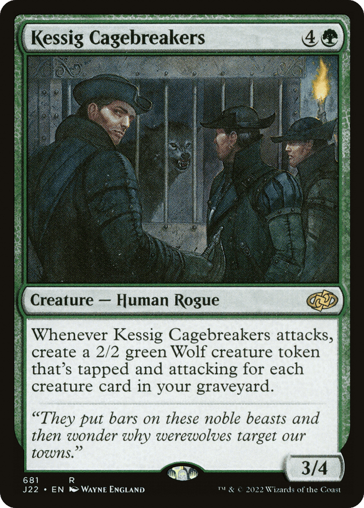Whenever this creature attacks, create a 2/2 green Wolf creature token that’s tapped and attacking for each creature card in your graveyard.