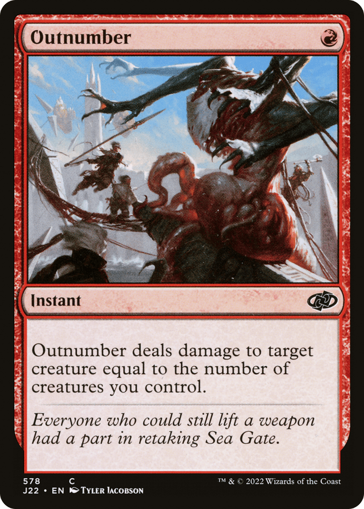Outnumber deals damage to target creature equal to the number of creatures you control.