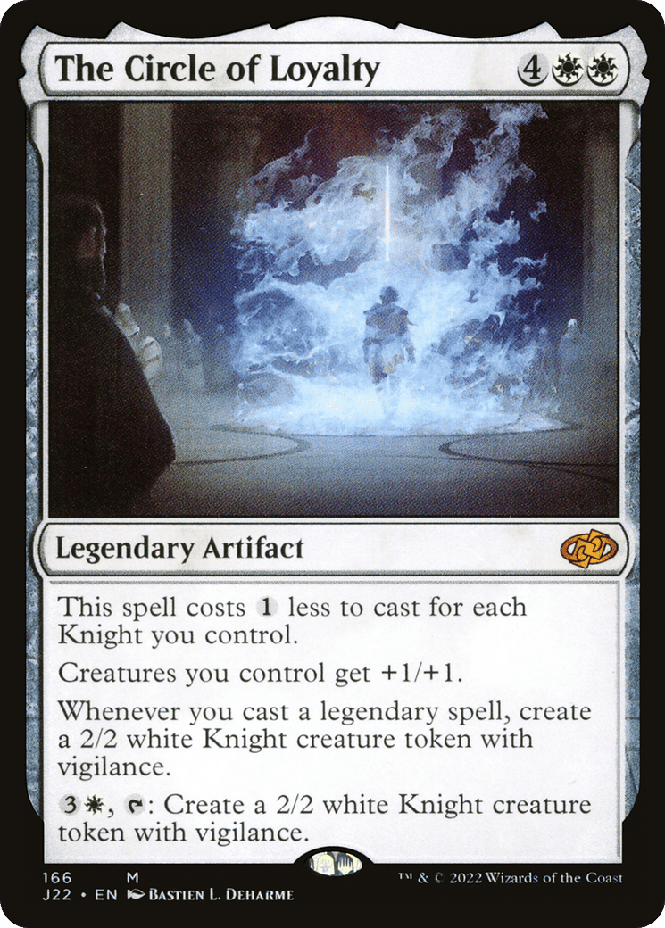 Whenever you cast a legendary spell, create a 2/2 white Knight creature token with vigilance.