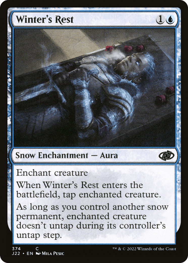 As long as you control another snow permanent, enchanted creature doesn’t untap during its controller’s untap step.