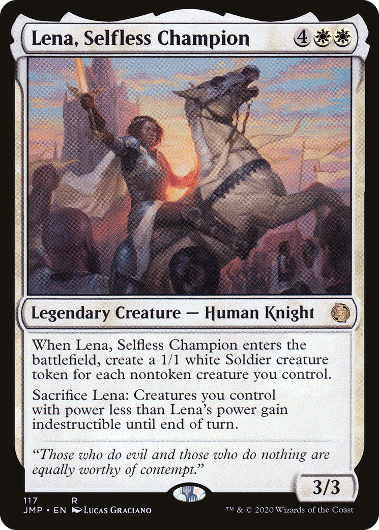 Sacrifice Lena: Creatures you control with power less than Lena’s power gain indestructible until end of turn.