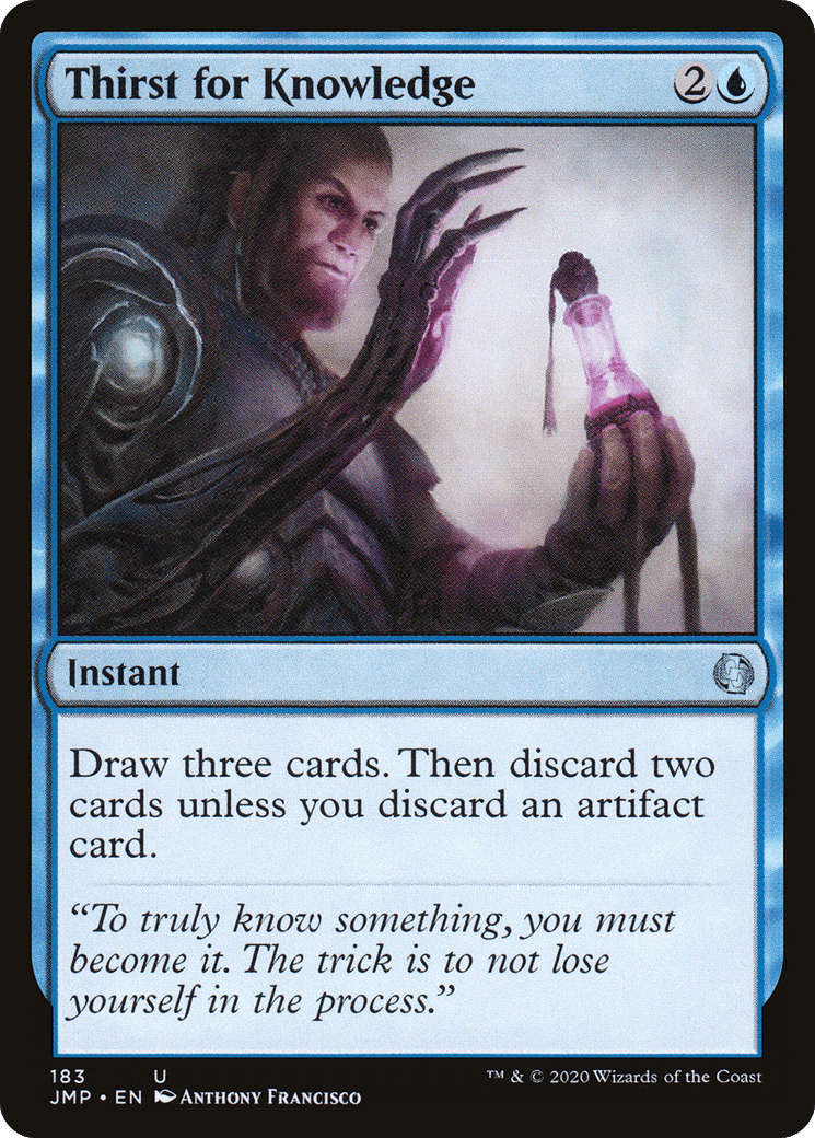 Draw three cards. Then discard two cards unless you discard an artifact card.
