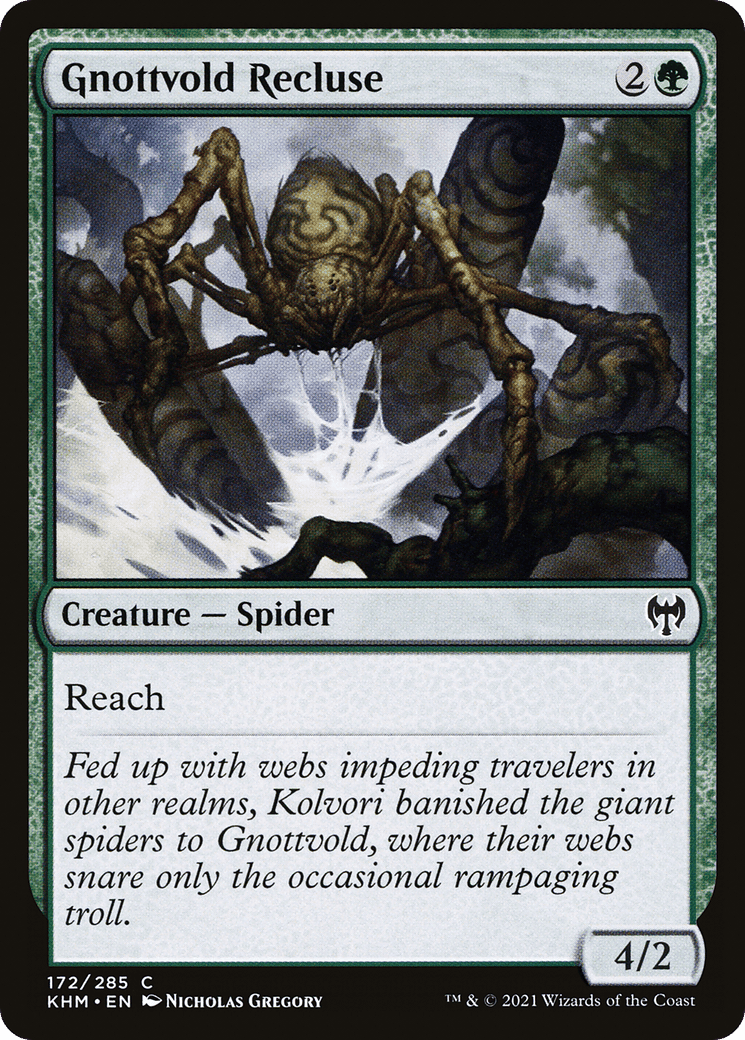 Fed up with webs impeding travelers in other realms, Kolvori banished the giant spiders to Gnottvold, where their webs snare only the occasional rampaging troll.
