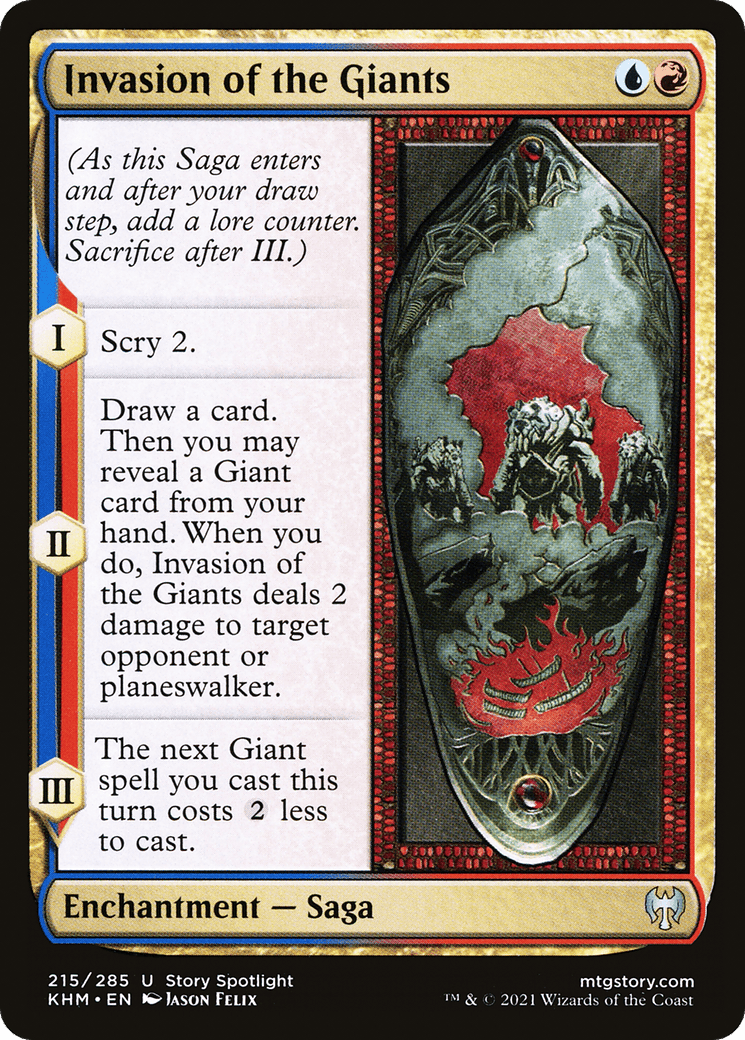 II – Draw a card. Then you may reveal a Giant card from your hand. When you do, this Saga deals 2 damage to target opponent or planeswalker.