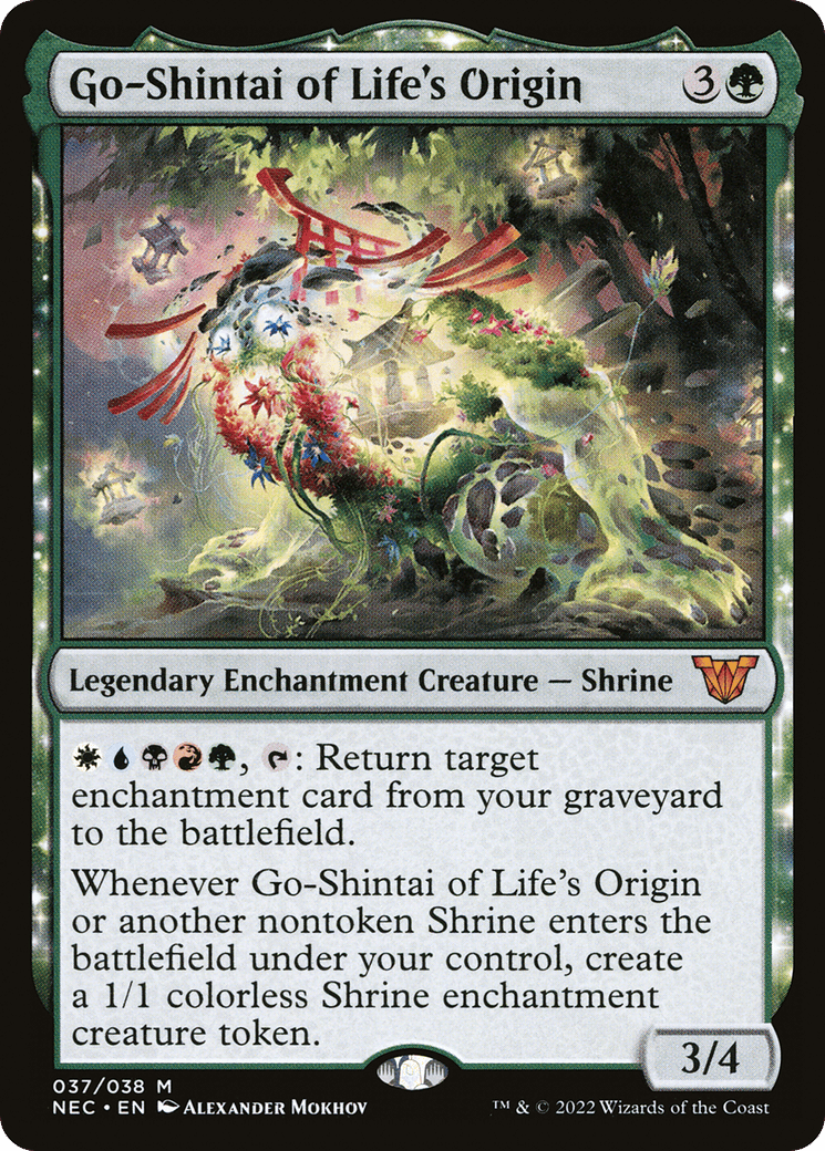 Whenever Go-Shintai of Life’s Origin or another nontoken Shrine you control enters, create a 1/1 colorless Shrine enchantment creature token.