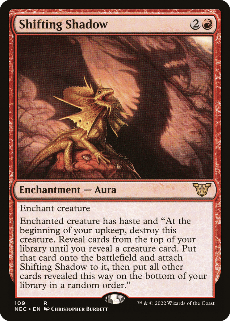 Enchanted creature has haste and “At the beginning of your upkeep, destroy this creature. Reveal cards from the top of your library until you reveal a creature card. Put that card onto the battlefield and attach Shifting Shadow to it, the