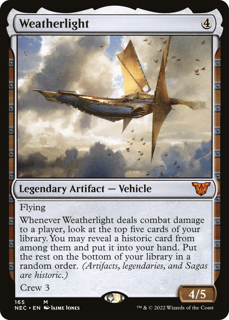 Whenever Weatherlight deals combat damage to a player, look at the top five cards of your library. You may reveal a historic card from among them and put it into your hand. Put the rest on the bottom of your library in a random order. (Artifacts, l