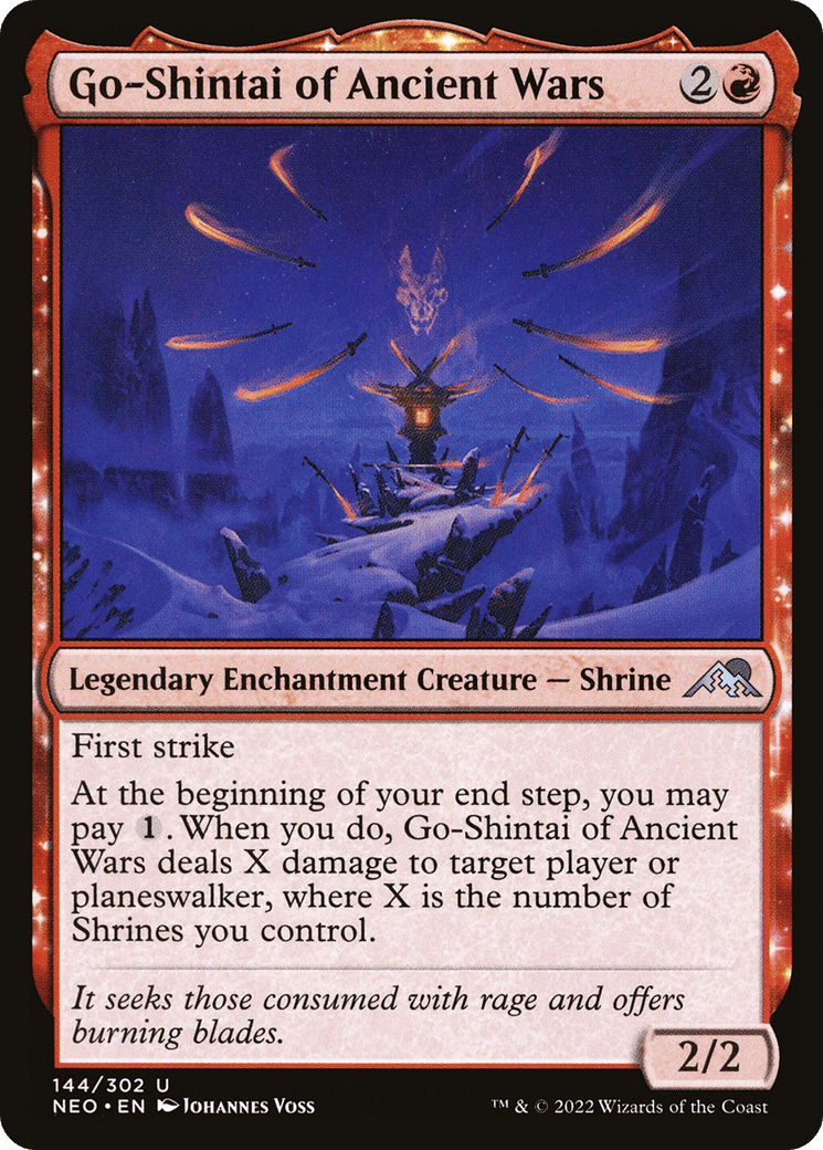 At the beginning of your end step, you may pay {1}. When you do, Go-Shintai of Ancient Wars deals X damage to target player or planeswalker, where X is the number of Shrines you control.