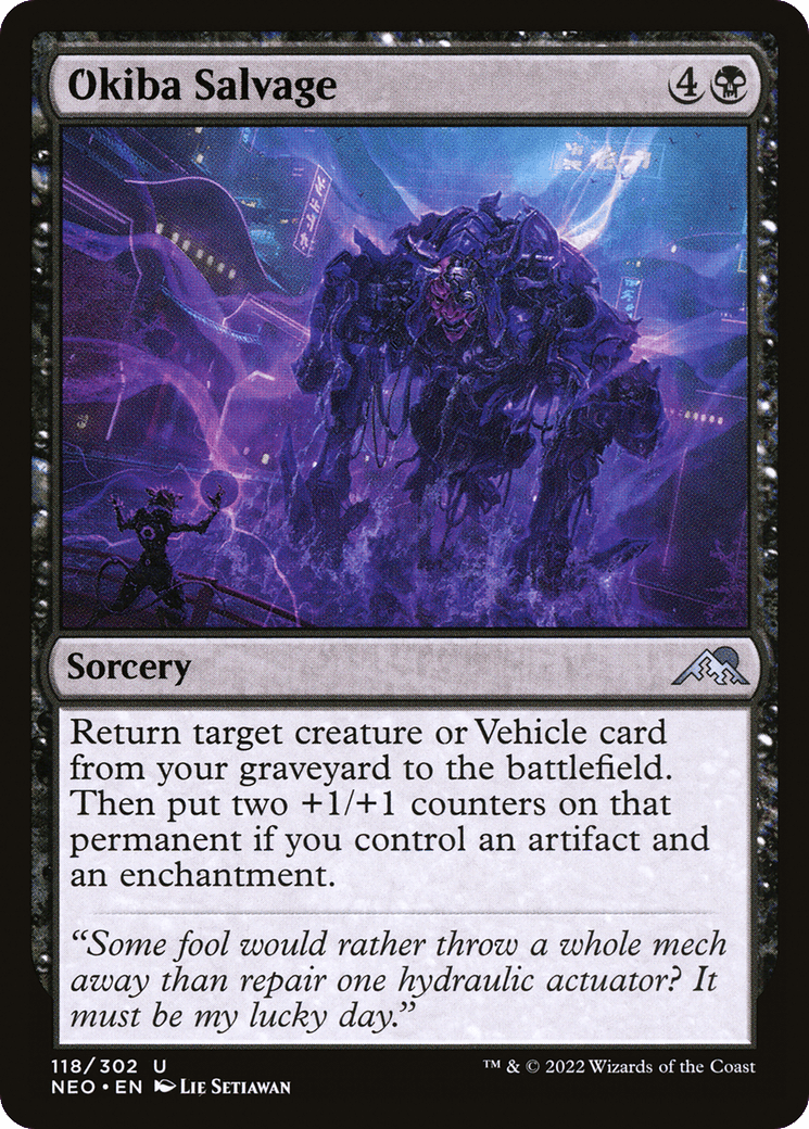 Return target creature or Vehicle card from your graveyard to the battlefield. Then put two +1/+1 counters on that permanent if you control an artifact and an enchantment.