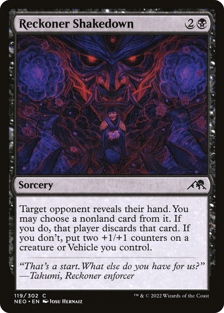 Target opponent reveals their hand. You may choose a nonland card from it. If you do, that player discards that card. If you don’t, put two +1/+1 counters on a creature or Vehicle you control.