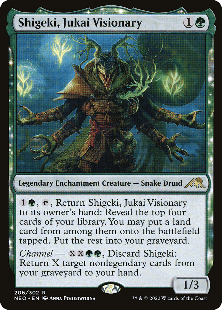 {1}{G}, {T}, Return Shigeki to its owner’s hand: Reveal the top four cards of your library. You may put a land card from among them onto the battlefield tapped. Put the rest into your graveyard.