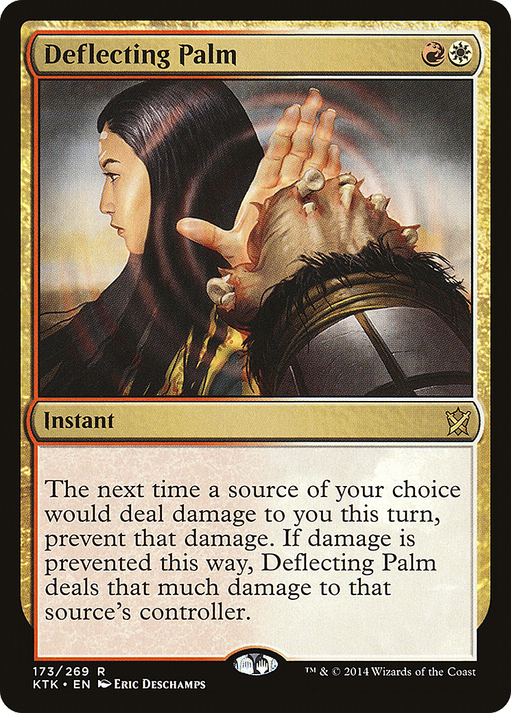 The next time a source of your choice would deal damage to you this turn, prevent that damage. If damage is prevented this way, Deflecting Palm deals that much damage to that source’s controller.