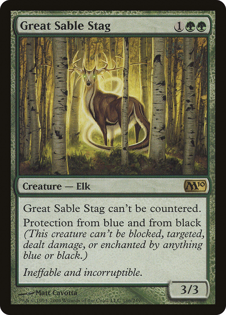 Protection from blue and from black (This creature can’t be blocked, targeted, dealt damage, or enchanted by anything blue or black.)