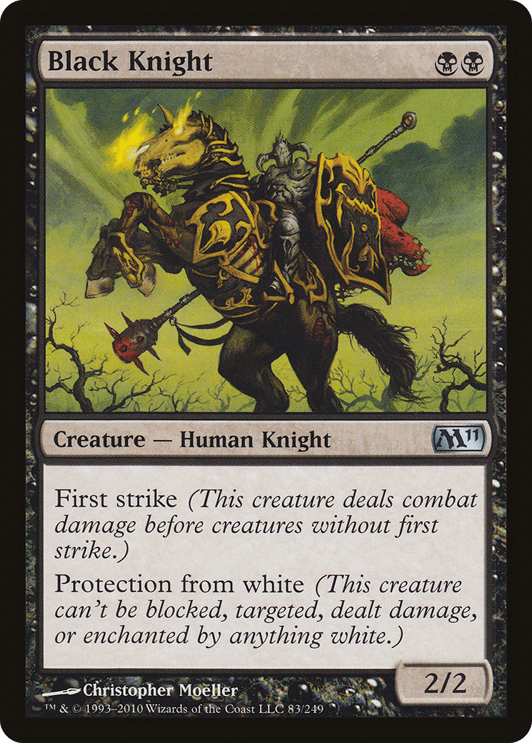 Protection from white (This creature can’t be blocked, targeted, dealt damage, or enchanted by anything white.)