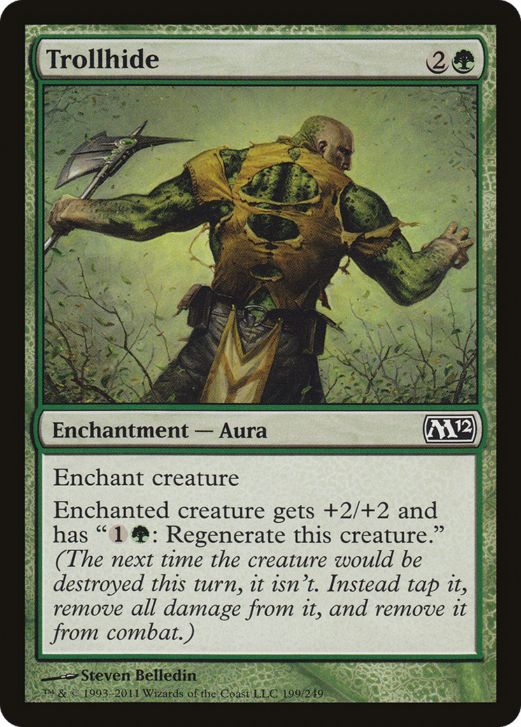 Enchanted creature gets +2/+2 and has “{1}{G}: Regenerate this creature.” (The next time the creature would be destroyed this turn, instead tap it, remove it from combat, and heal all damage on it.)