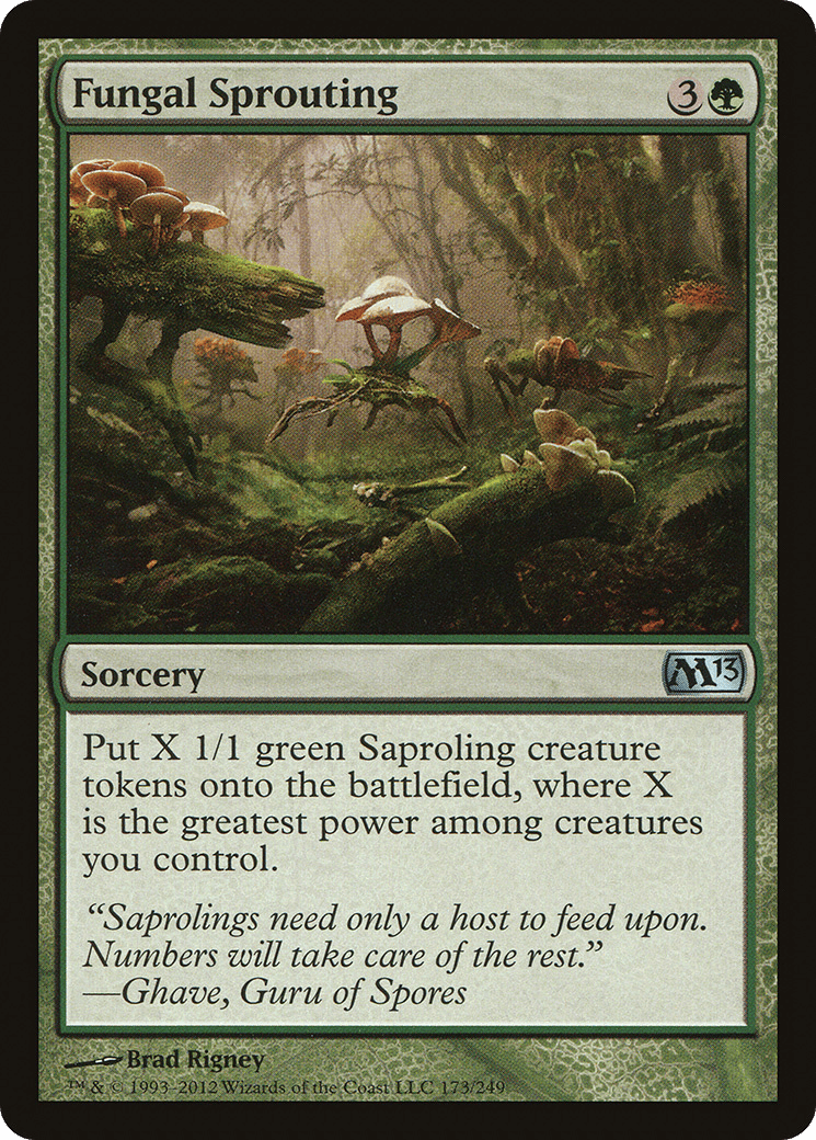 Create X 1/1 green Saproling creature tokens, where X is the greatest power among creatures you control.