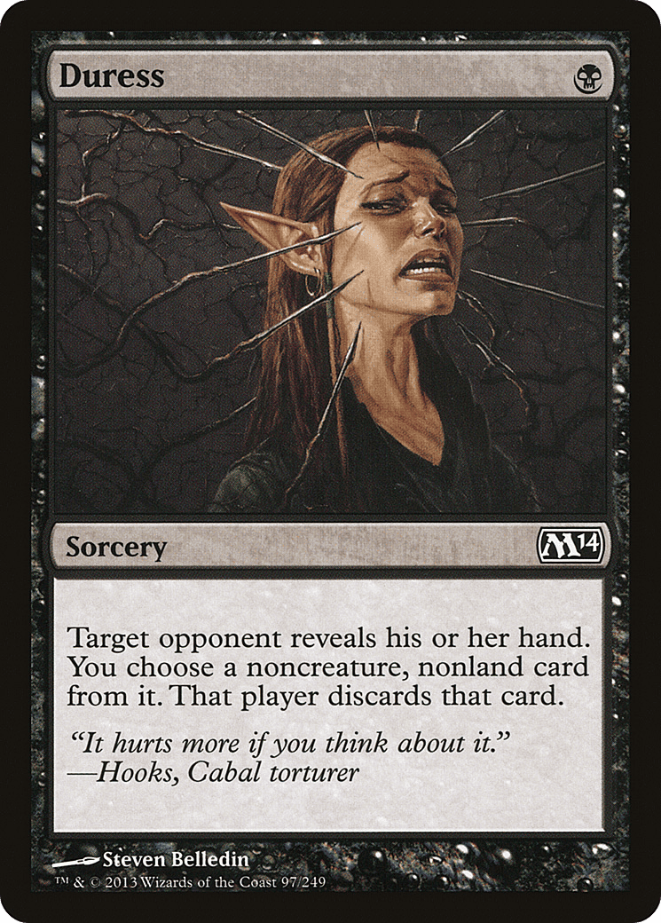 Target opponent reveals their hand. You choose a noncreature, nonland card from it. That player discards that card.