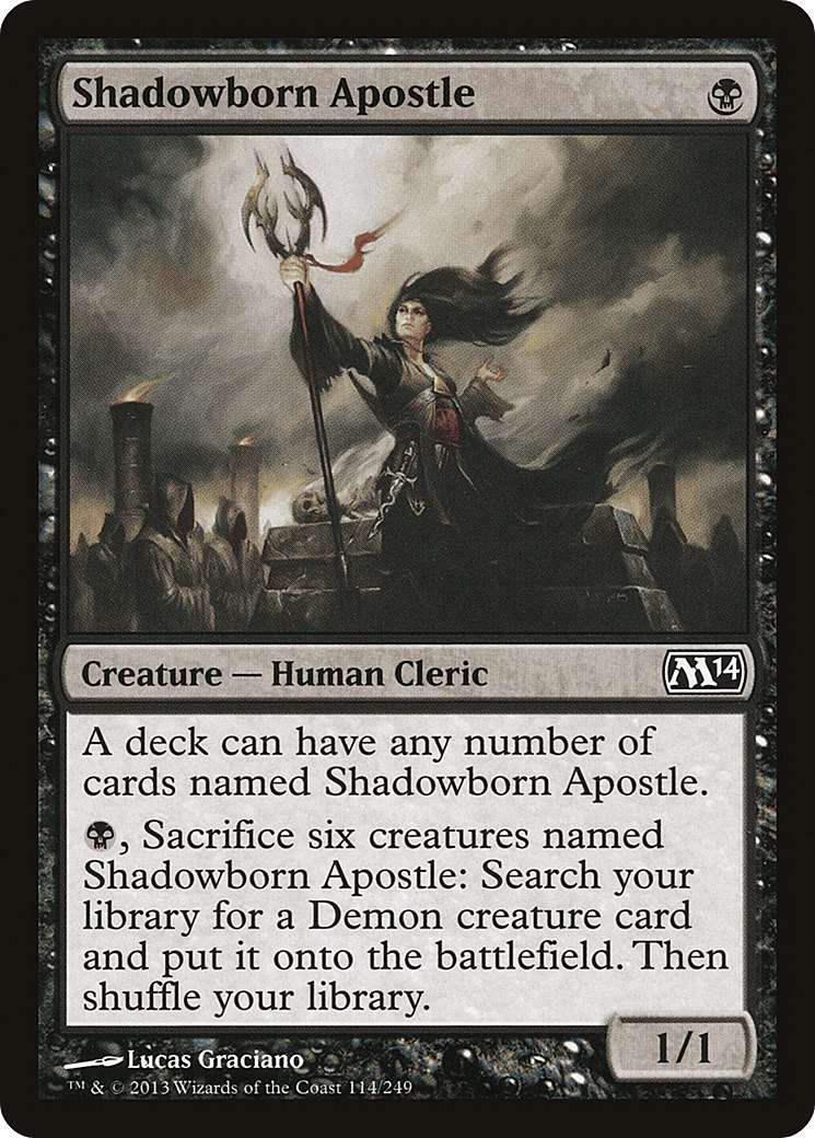 {B}, Sacrifice six creatures named Shadowborn Apostle: Search your library for a Demon creature card, put it onto the battlefield, then shuffle.