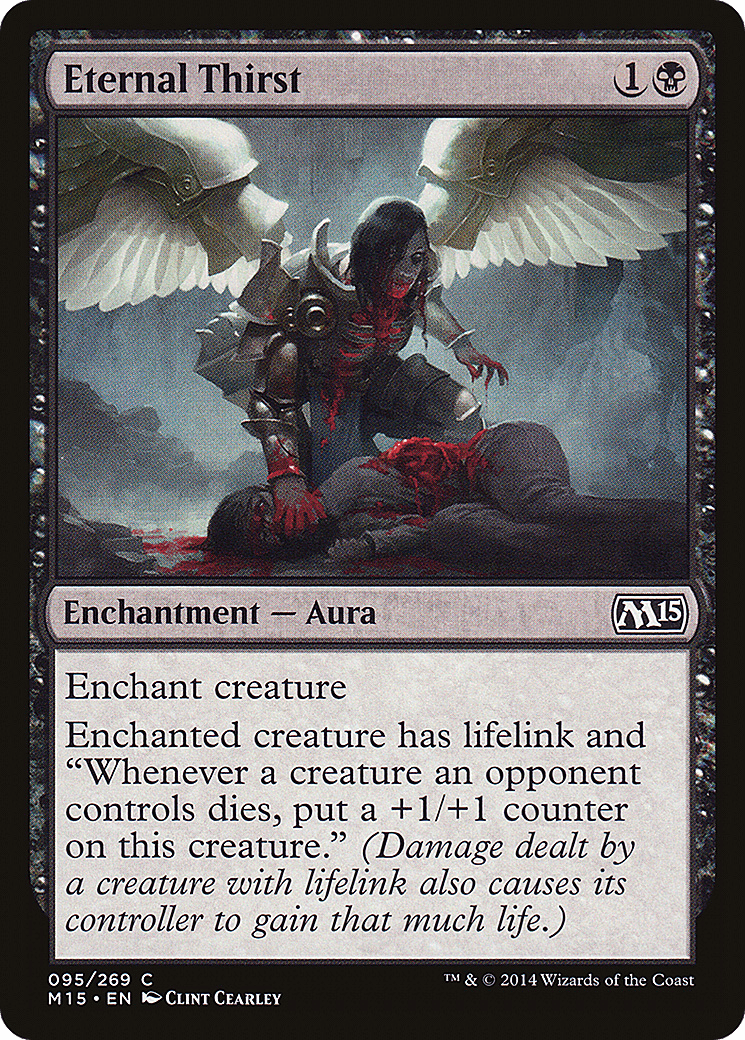 Enchanted creature has lifelink and “Whenever a creature an opponent controls dies, put a +1/+1 counter on this creature.” (Damage dealt by a creature with lifelink also causes its controller to gain that much life.)