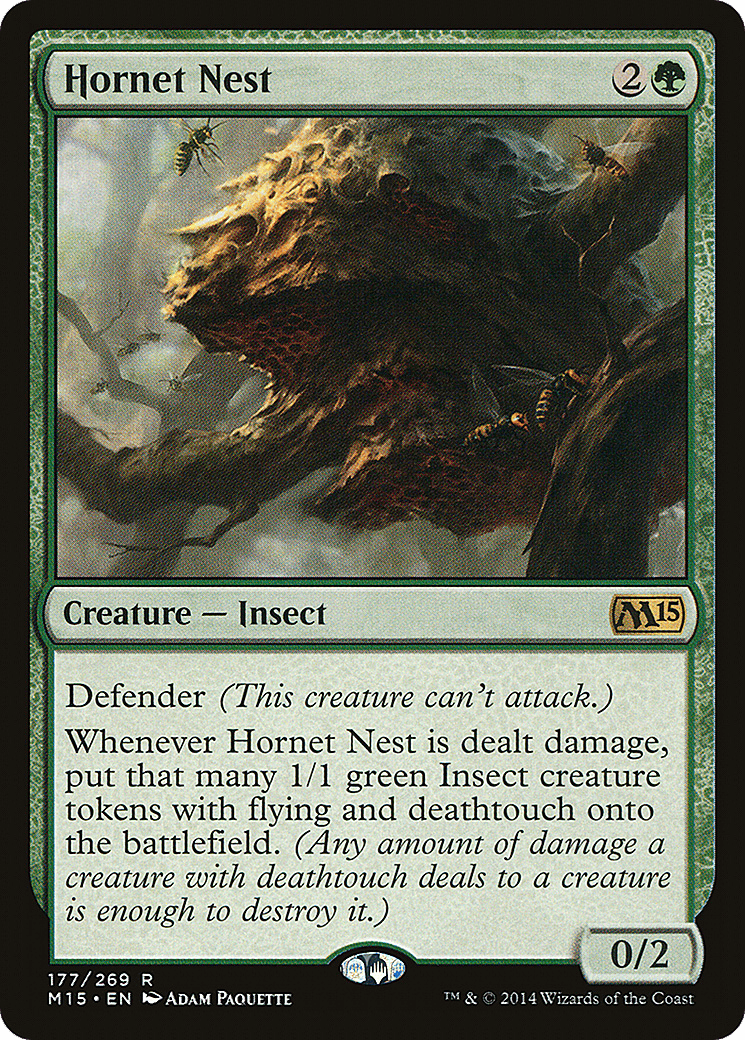 Whenever this creature is dealt damage, create that many 1/1 green Insect creature tokens with flying and deathtouch. (Any amount of damage a creature with deathtouch deals to a creature is enough to destroy it.)
