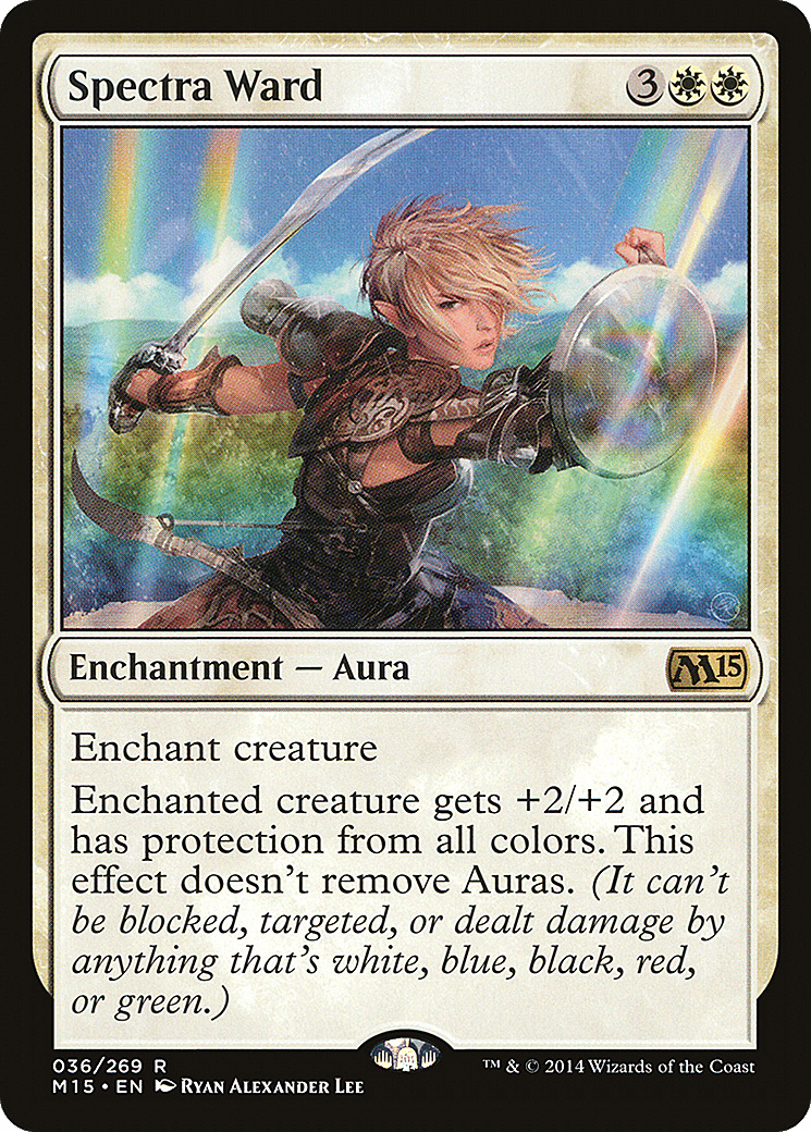 Enchanted creature gets +2/+2 and has protection from each color. This effect doesn’t remove Auras. (It can’t be blocked, targeted, or dealt damage by anything that’s white, blue, black, red, or green.)