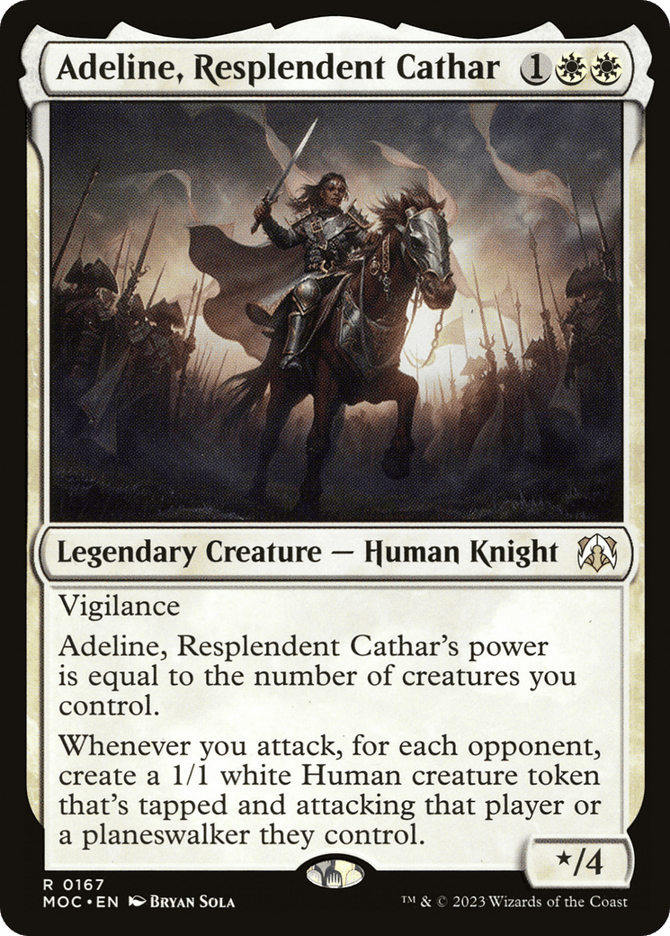 Whenever you attack, for each opponent, create a 1/1 white Human creature token that’s tapped and attacking that player or a planeswalker they control.