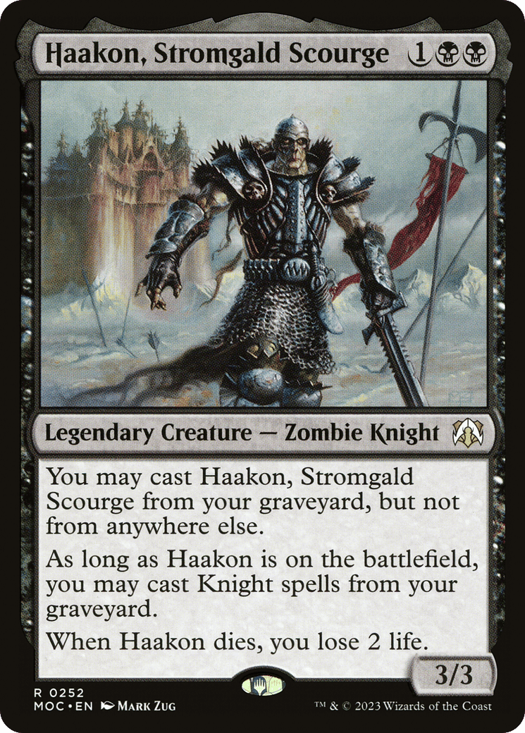 As long as Haakon is on the battlefield, you may cast Knight spells from your graveyard.